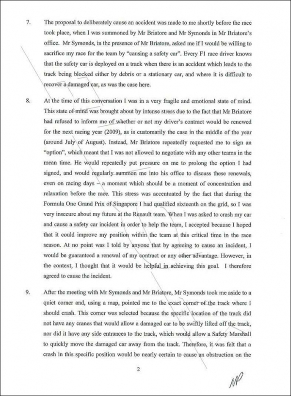 At the time of this conversation I was in a very fragile and emotional state of mind. This state of mind was brought about by very intense stress due to the fact that Mr Briatore had refused to inform me of whether or not my driver’s contract would be renewed for the next racing year (2009) as is customarily the case in the middle of the year (around July or August). […]