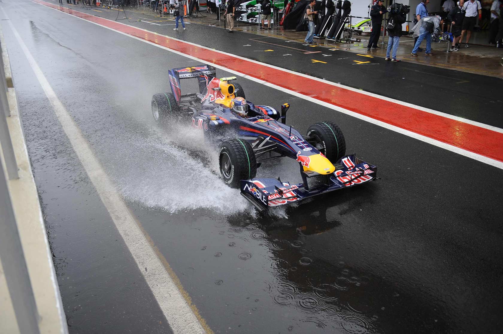 Q3 was fun. All the cars were on intermediate tires and no one bothered to change tires during the session. So we had ten cars running around and trading fast laps. Provisional pole traded hands so many times that you weren’t really sure who would be on pole until all the cars crossed the line. Hell, Adrian Sutil was the last man to complete his final lap and even he was in with a shot at pole. Mark Webber, Robert Kubica, Jarno Trulli, and even Sebastien Buemi had the fastest lap for a time in Q3. In the end, it was hometown boy Rubens Barrichello who won the pole… Not that it helped him in the end.