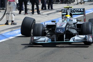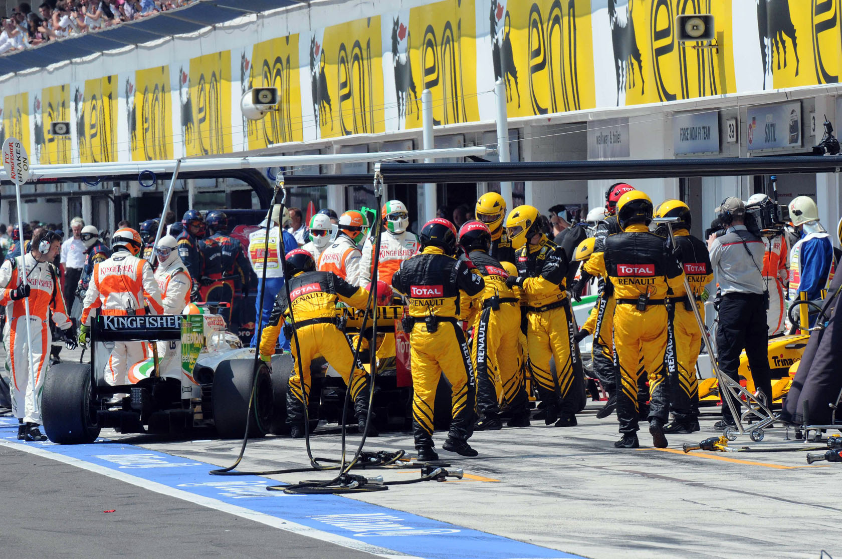 Just up the road from the three-wheeled Mercedes, Renault and Force India had a too close encounter. Robert Kubica’s Renault was released from his pit stall just as Adrian Sutil pulled into his pit stall for his stop. The Force India was pitting directly ahead of the Renault so the pair collided. It was game over immediately for Sutil while Kubica was able to circulate for a couple more laps. For their troubles, Renault was handed a $50,000 fine. So it’s $50k for causing a collision but shuffling the order of cars is twice that. That’s about $200,000 too much money that the FIA has collected from F1 teams over the last two weeks.