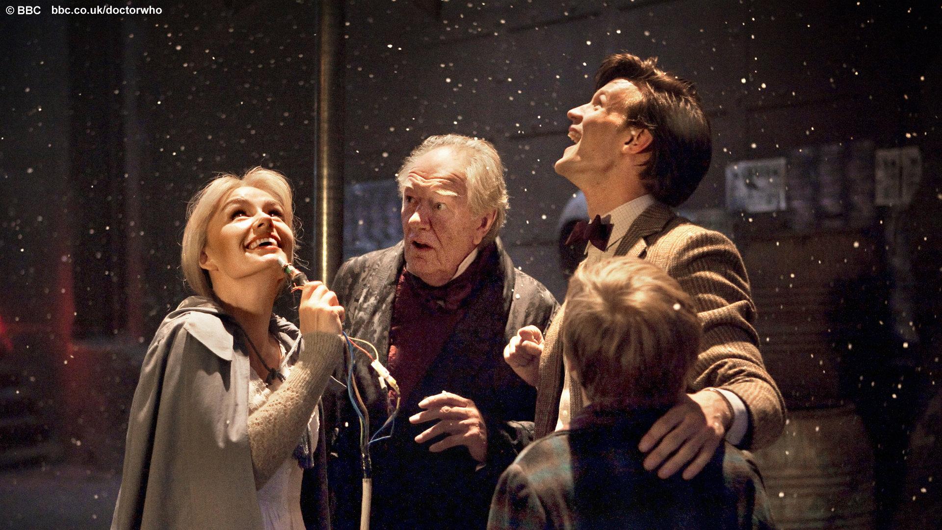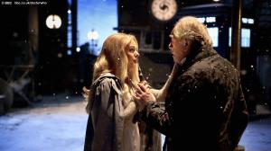 We immediately meet our equivalent to Scrooge, Kazran Sardick played by Sir Michael Gambon. Rather than not letting his workers get Christmas off, he’s telling a poor family that he won’t let a frozen woman that’s being used as security for their loan out for Christmas. And that’s when the Doctor shows up by falling down Sardick’s chimney in Santa-esque style. Long story short, Sardick doesn’t take kindly to his visitors and throws them all out. The only problem is that Professor Dumbledore controls a machine that will lower the energy shield and allow the spaceship to land safely on the planet. Thanks to some Christmas carols played over the city’s loudspeakers, the Doctor is inspired to do A Christmas Carol routine on Sardick.