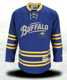 The Sabres have done away with the Sabres slug jersey and gone completely retro with the old buffalo leaping over the sabres logo. Now, we’ve got a leaping “Buffalo” instead of a leaping buffalo. The circular logo is still there but it’s quite small. It’s basically the home jersey with a different chest logo but I still like it.