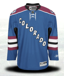 The third jersey is predominately blue. I’m not sure if that’s a nod to the Nordiques or the Nuggets. I know they do use some blue in their jerseys but that much seems out of place. The black stripe on the sleeve also seems out of no where and clashes with the blue. (I think. I probably should never use “clashes” again.) Getting rid of that weird foot logo on the regular uniforms is an improvement, though.