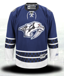 This jersey is very clean and the two checkered stripes are fairly unique but that’s about it. They used the same dark grey-blue that they use in their other jerseys. The use just seems unimaginative. And what does a checkered pattern have to do with Nashville? Yes, there’s a strong history of stock car racing there but they’re so busy trying to kill the history of racing in Nashville with the closing of the old Fairgrounds Speedway, the last place it needs a tribute is on the ice.