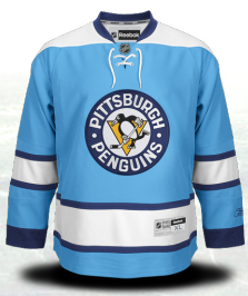 While the Pens will be using a dark blue shirt for the Winter Classic, their original Winter Classic jersey is considered their third jersey. There’s the retro element in using the powder blue colour scheme that traces back to the 1970s (though not using that logo). While I like the design, I just can’t get behind powder blue on a hockey jersey. That’s a colour for baseball umpires, not hockey players.