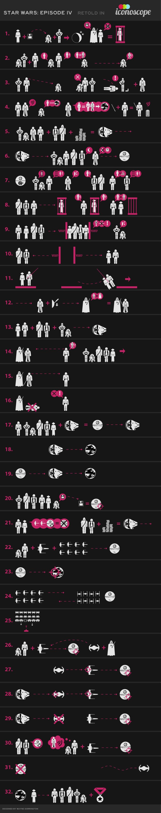 Here at Lowdown HQ, we’re huge fans of Star Wars. Naturally, when we see something as completely awesome as this, we’re obligated to post it. British illustrator Wayne Dorrington has retold Star Wars: Episode IV – A New Hope using only icons.