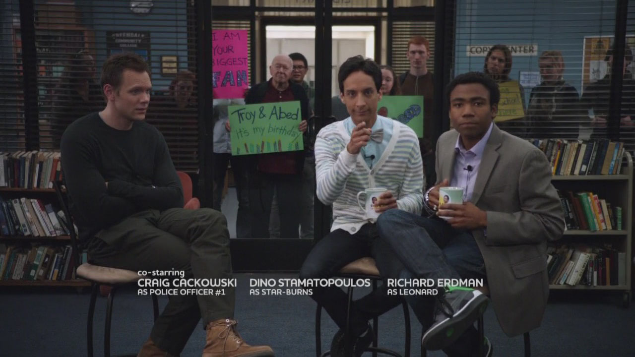 The second part of Occupy Community Colleges is public address announcements. Now, the likelihood of a college or university having announcements over a public address system is probably slim. However, if you have access to a public address system, all your announcements should start and end by singing “Troy and Abed in the morning.” Not everyone may get it but if you put up some Troy and Abed signs that point people towards Community, it just might work.