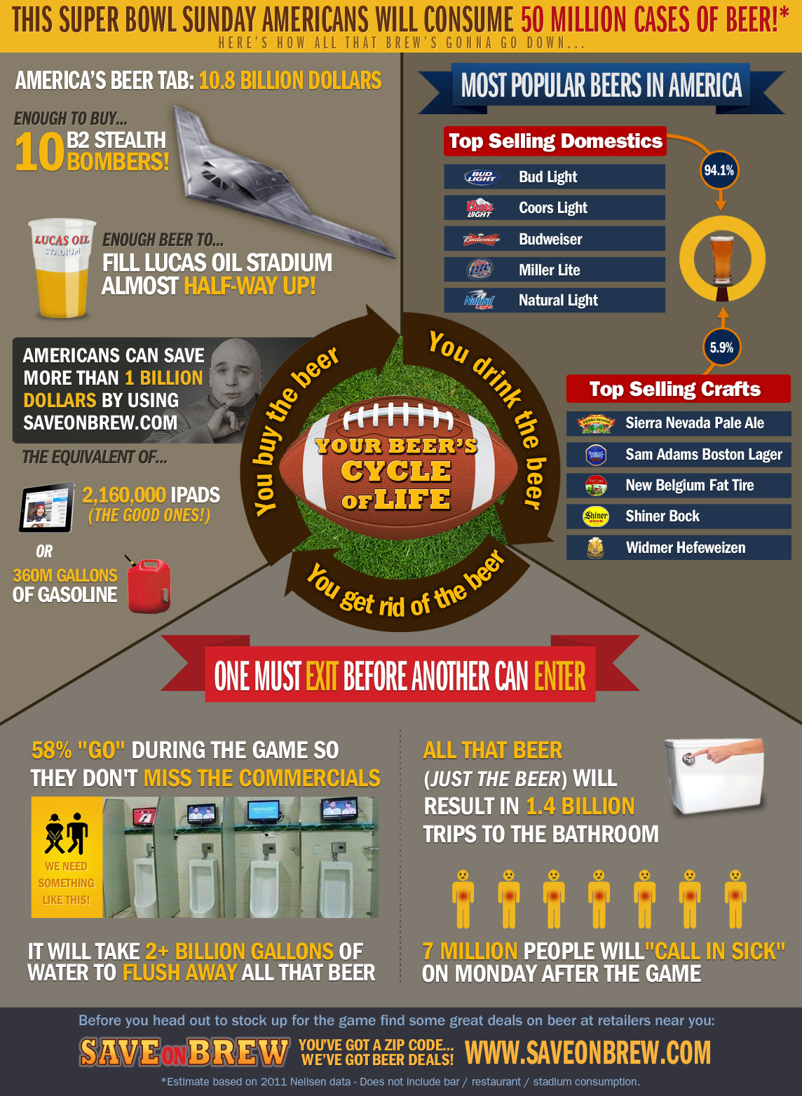 For a breakdown of what will be drunk and how much will be spent (among other interesting tidbits), we have an infographic about beer and the Super Bowl after the jump.