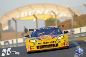 The #67 IMSA Porsche had been up front early but lost the lead to the polesitting #79 Flying Lizard Porsche 911 before the first safety car. However, team owner Seth Neiman crashed at Arnage which cost the team ten laps while repairing the car which dropped them from the lead to out of contention. That gave the lead to IMSA’s #67. In the early morning with 10 hours to go, the IMSA Porsche stopped to get new brake pads which put the #50 Larbre Corvette on point.