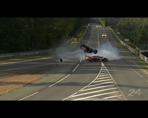 However, luck wasn’t on Toyota’s side. At the start of the fifth hour of the race, Anthony Davidson’s #8 Toyota was sideswiped by the #81 GTE Am Ferrari 458 of AF Corse driven by Piergiuseppe Perazzini heading into the Mulsanne hairpin. The Toyota TS030 got airborne and did a flip before crashing into the tyre wall. The Ferrari spun and slammed into the wall even harder than the Toyota. The clean-up and repairs to the tyre wall and armco barrier resulted in an hour-long stint under the safety car. Davidson suffered two broken vertebrae in the incident but a Toyota statement following the accident said Davidson was walking and talking in the track medical centre. Later reports say that Davidson is expected to make a full recovery.