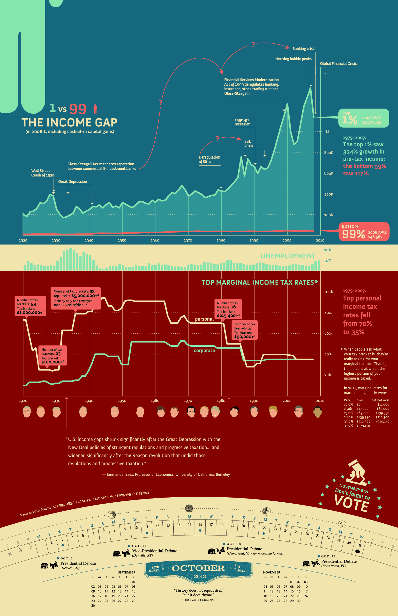 I say that because the wealth gap between the rich and poor has grown massively over the last 90 years. In terms of real dollars, the gap between the average one-percenter and the 99% was never bigger than at the peak of the housing bubble. In 2008 (the last year with complete data), the average pre-tax income of the top 1% was almost $1.1M greater than the bottom 99-percent’s. For these and more facts about the disparity between America’s rich and poor, we have a handy infographic for your perusal.