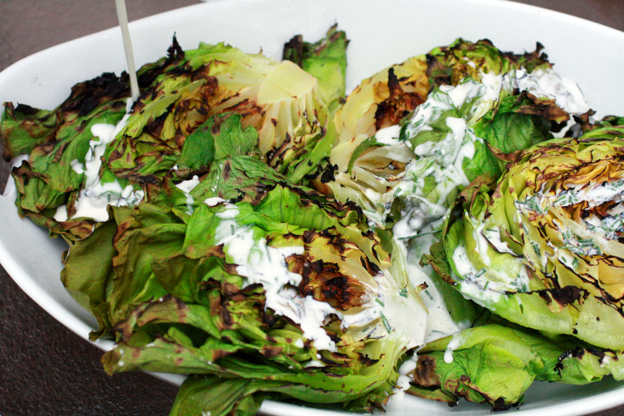 Lightly season the lettuce with 1/4 tsp. salt. Grill cut side down until wilted, lightly charred, and the cores are crisp-tender, 2 to 3 minutes.