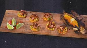 For corn, place corn cobs over hot coals or on a barbecue or a grill plate on a wok burner on medium heat and occasionally turn, cooking for 20-30 minutes. Once corn is cooked, cut one corn cob in half and serve with lime butter, and while still warm, cut off corn kernels from the other corn cob and mix with one tablespoon lime butter.
