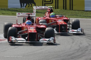 Lewis Hamilton scored pole just ahead of teammate Jenson Button for the Italian GP. While Lewis led away from the lights, Button was swiftly pipped off the line for second by Felipe Massa. However, Massa couldn’t keep pace with Hamilton who stormed off and wasn’t seen again. Ferrari’s Fernando Alonso started 10th but was up to 6th within one lap as he slashed his way through the field. It took the Spaniard five laps to get by Michael Schumacher for 5th and 22 laps after that to get by Vettel for 4th (which included a close call as Vettel forced Alonso wide at the Curva Grande as he tried to pass the Red Bull driver on the outside).