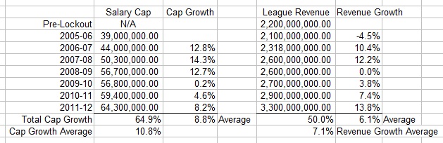 When you look at my comparison of revenue growth versus cap growth, you can see that the cap grows at a rate faster than revenue growth in the prior season. That’s because of the 5% midpoint increase that the NHLPA has gladly taken advantage of five out of the six opportunities they’ve had to exercise it.