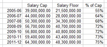 In 2005-06, the cap and floor were set at negotiated, pre-determined amounts. From 2006-07 onwards, the calculations specified in the CBA determined the cap and floor. As a result, the floor as a percentage of the cap as increased from 55% in 2005-06 to 75% of the cap in 2011-12. In other words, whether they can afford it or not, teams are being forced to spend more money in terms of a percentage of their revenue and actual dollars.