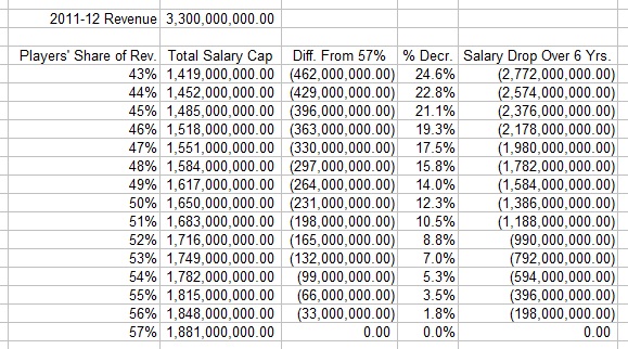 The initial proposal of giving players 43% of HRR would have slashed players salaries by 24% from the current 57% of HRR. Coincidentally, player salaries were rolled back by 24% when the outgoing CBA was introduced in 2005. The owners say they lost $240 million in total over the last two seasons. Based on the table below, the owners will save that amount in player salaries by dropping the players’ percentage of HRR to 53% percent which would represent the players losing 7% of current salaries. That doesn’t include the change in the definition of hockey-related revenue that the league initially proposed which would decrease the revenue pool that would be used as a basis for the salary cap.