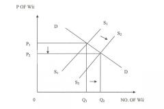 The premise of supply-side economics is to spur economic growth through lowering the barriers to increased production of goods and services through lowering taxes on income and investment income. In terms of the shifting the old Economics 101 stalwart supply curve, this would shift the supply curve to the right. As a result, increasing supply results in a higher quantity of goods being produced for a lower price to the consumer. Lowering the price as a result of the lower cost increases demand which drives the economic growth through consumer spending.