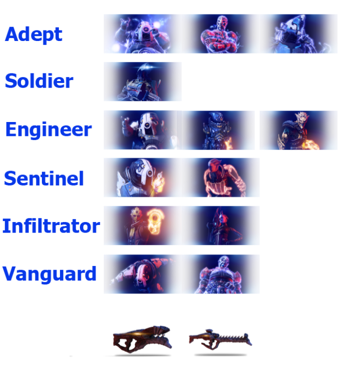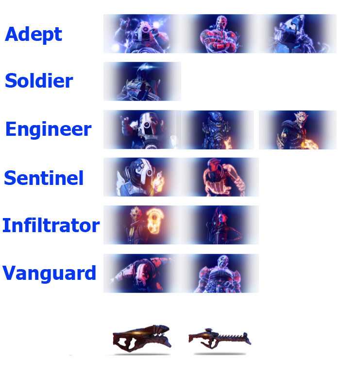 Data-mined from patch (unconfirmed): Asari Valkyrie Sentinel, Batarian Slasher Adept, Quarian Marksman Soldier, Turian Saboteur Engineer, Volus Adept, Volus Engineer, Volus Protector Vanguard, Volus Mercenary Sentinel, Vorcha Hunter Engineer