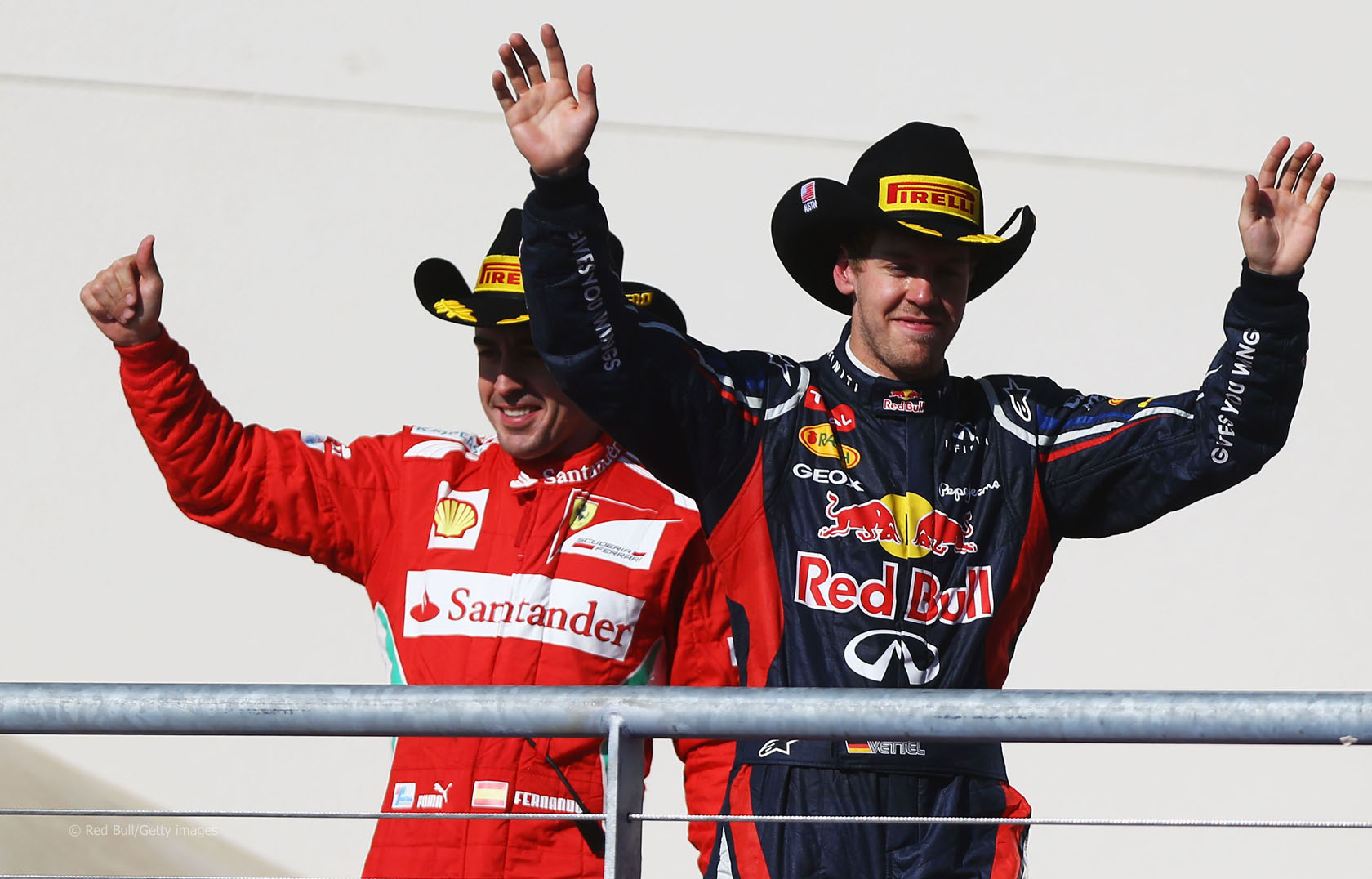 With Vettel only 13 points up on Alonso, if Vettel doesn’t score in Brazil, Alonso needs to finish 3rd or better. Even if Alonso were to win, all Vettel would have to do is finish 4th. They would be tied on points but Vettel would be World Champion based on more wins. Alonso can still win if he finishes 2nd and Vettel worse than 7th or if he finishes 3rd and Vettel worse than 8th. If Alonso finishes 4th or worse, Vettel will be the world champion for the third-straight year.