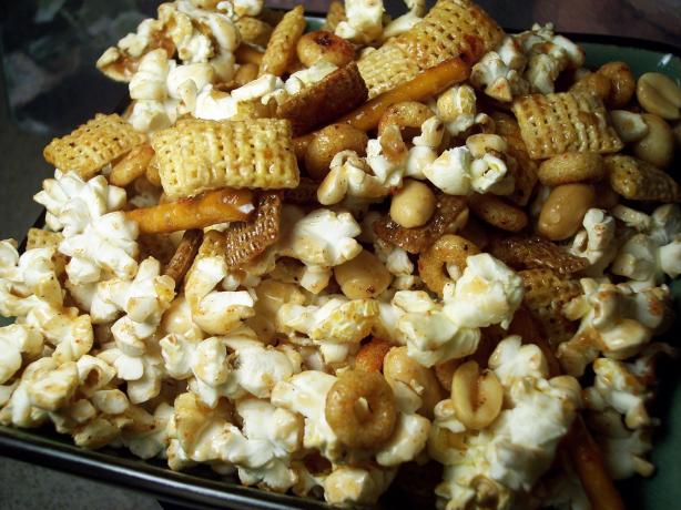 Combine tortilla chips, cereal, popcorn and nuts in a large roasting pan.