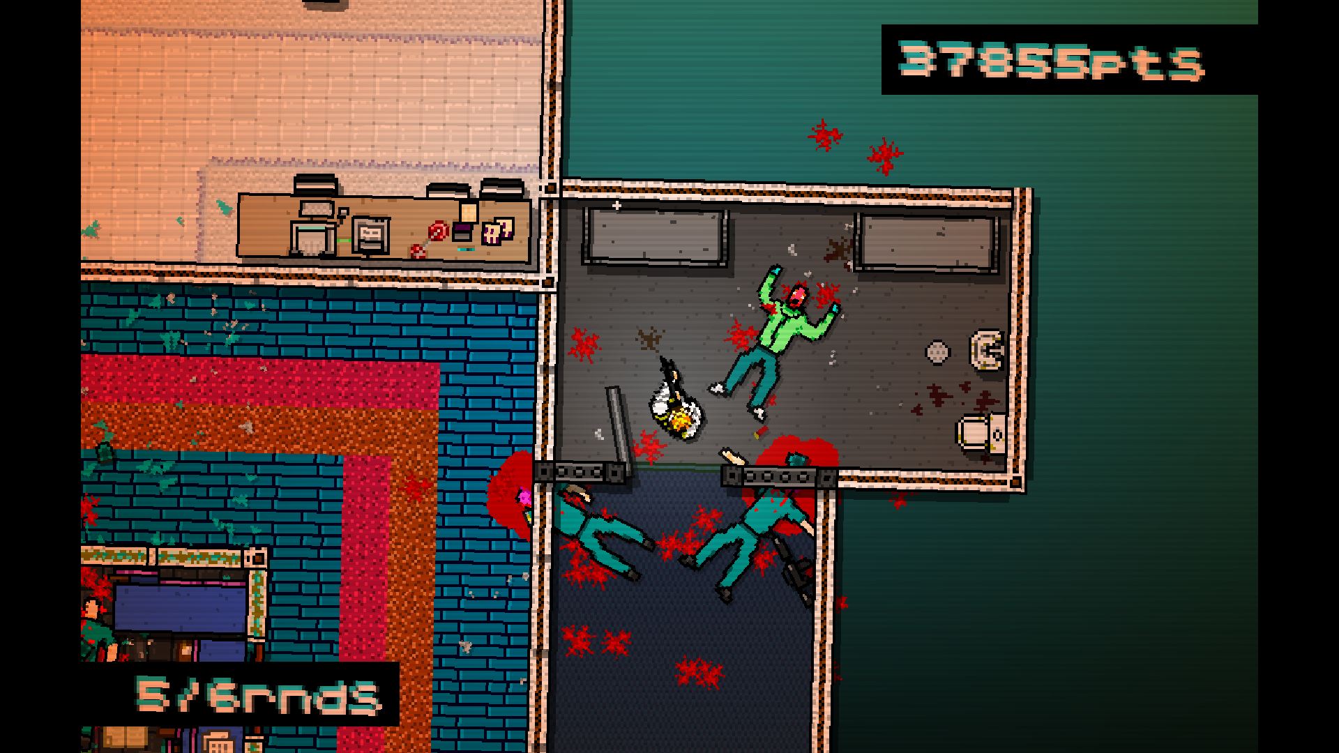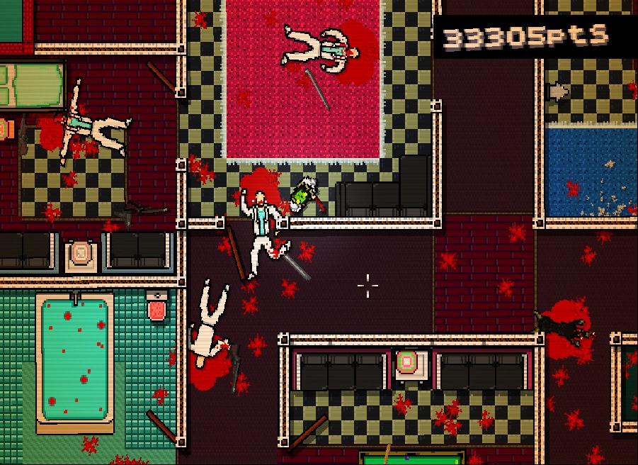 As I mentioned earlier, classic GTA was a top-down game. Hotline Miami has that visual style, complete with retro-quality (occasionally described as 16-bit) graphics, it looks much more violent. You’ll beat enemies brains in or leave their blood soaking into the floor in order to kill them and the game isn’t afraid to show blood.
