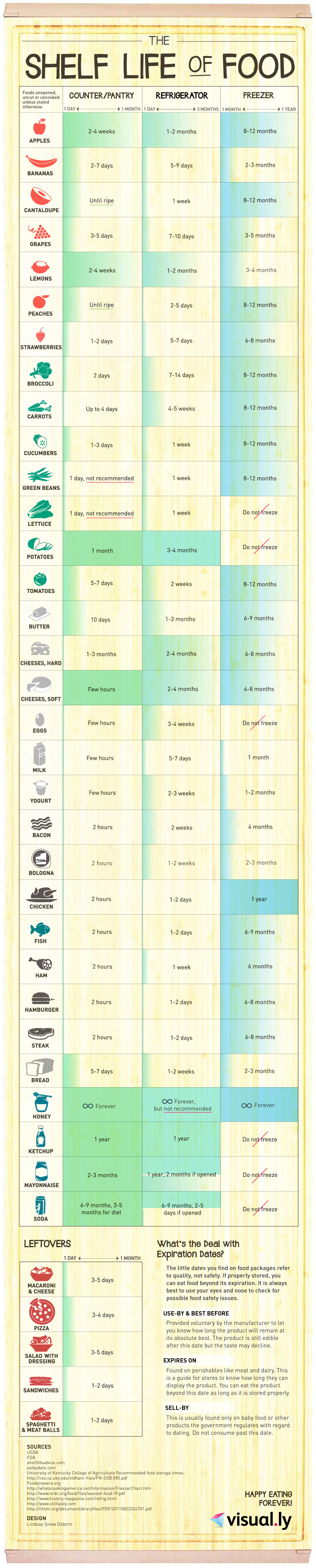 Note: The times listed in this infographic unopened, uncut and uncooked foods unless otherwise stated. For example, opened mayo isn’t lasting two months on the shelf.