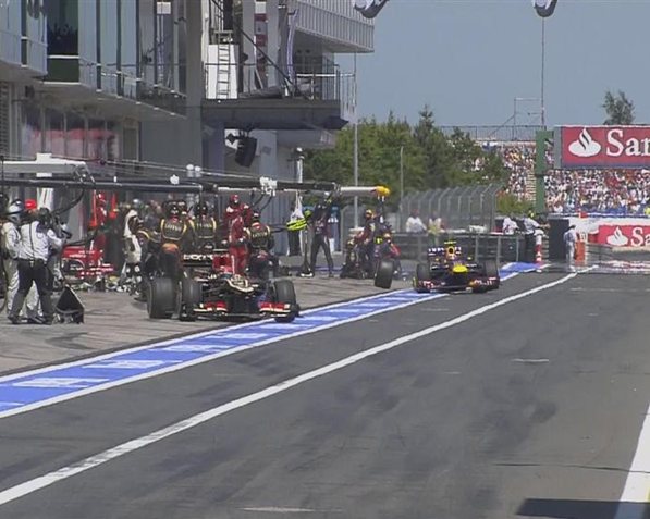 The race was definitely not without incident. On Lap 4, Felipe Massa spun all by himself heading into Turn 1 and retired when his car stalled. A few laps later, Red Bull had a problem with Mark Webber’s pit stop which meant he was released with a loose left-rear tyre. The tyre came off in the pitlane and hit an FOM camera man who suffered a few broken bones (shoulder and ribs according to some reports). Webber was retrieved and got a left-rear tyre but he was a lap down.