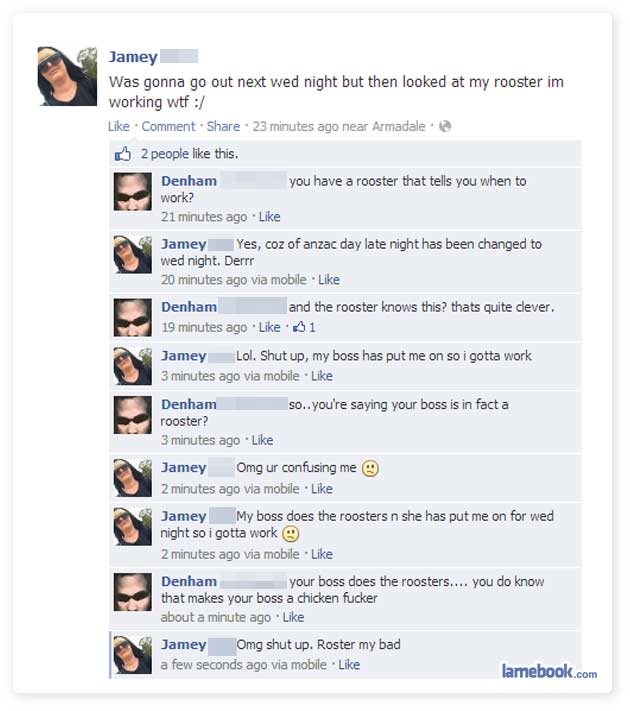 Posted on August 13, 2013August 12, 2013 by Steve Murray Humour Facebook Fails of the Week Every so often, we look at the most spectacular fails that the internet has to offer. Well today, we look at the most spectacular fails that Facebook has to offer. This week, we have five of the best fails Facebook has to offer. Share on X (Opens in new window) X Share on Facebook (Opens in new window) Facebook Share on Tumblr (Opens in new window) Tumblr Share on Reddit (Opens in new window) Reddit Share on Pinterest (Opens in new window) Pinterest More Share on LinkedIn (Opens in new window) LinkedIn Share on WhatsApp (Opens in new window) WhatsApp Share on Telegram (Opens in new window) Telegram Share on Pocket (Opens in new window) Pocket Email a link to a friend (Opens in new window) Email Print (Opens in new window) Print Like Loading... Related